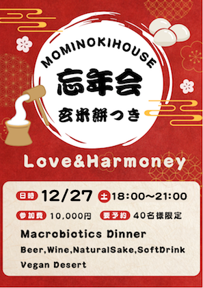 毎年恒例の玄米餅つきを開催いたします。お餅をつくと運がつくと言われています。自然界ラッパーOMGのライブもあります。皆様、ふるってご参加ください!